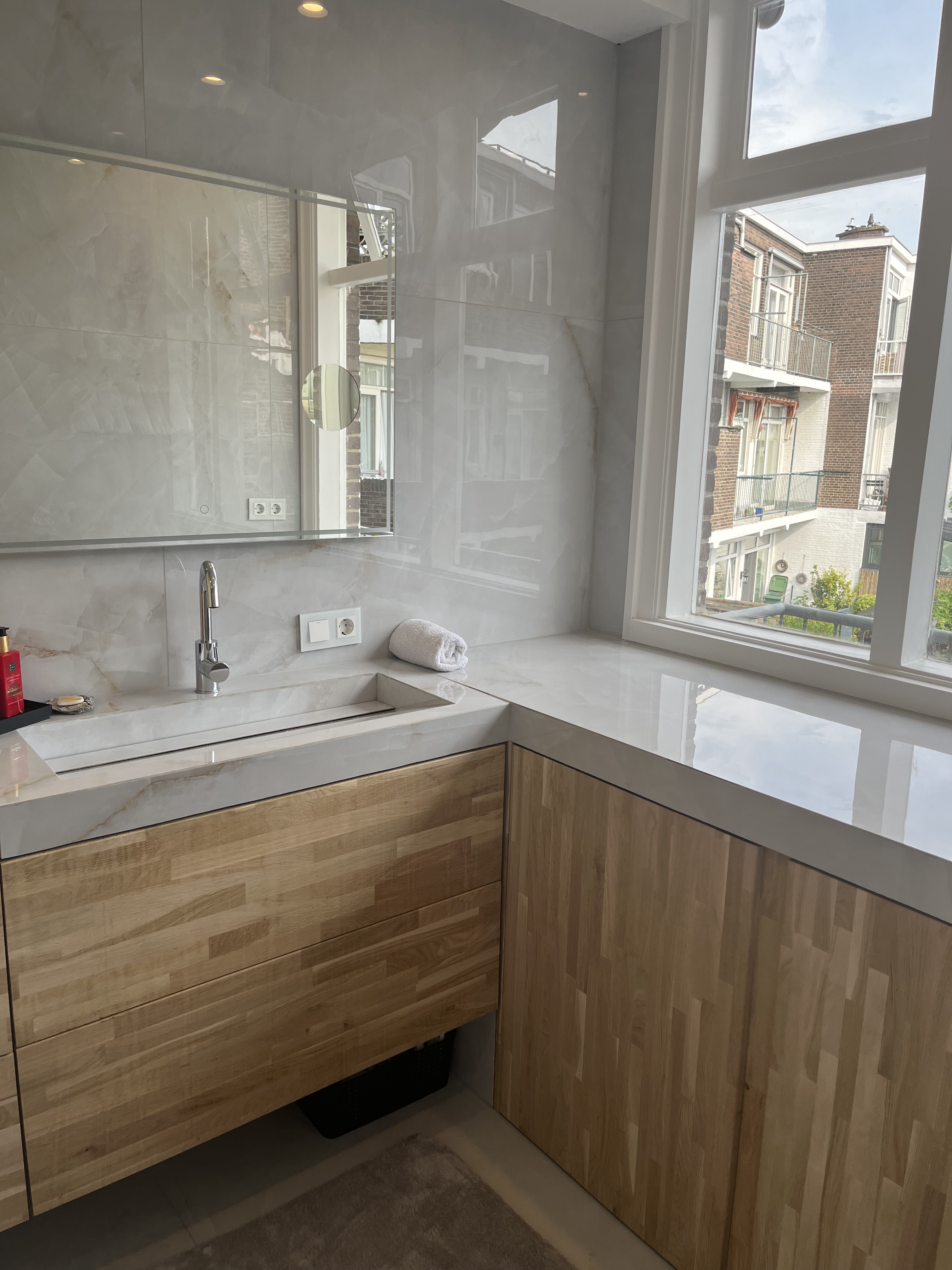 Dit is een zeer bijzondere badkamer geworden waarbij de klant ook graag een wastafel op maat heeft aangevraagd. Onze vaste aannemers hebben een wastafel op maat gemaakt met de uitgekozen prachtige slabs van Slabspecialist.